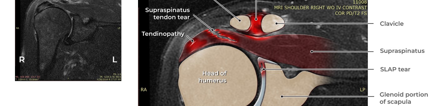 Justin S. Kahn of Kahn Law Firm, LLP was retained and filed suit. Discovery took place and the defense identified two orthopedic surgeons as experts who were prepared to testify that the SLAP tears were not caused by the collision. One of the defense orthopedists would testify that the knee was related to the collision but only minor arthroscopic surgery was needed, and both were going to blame the other problems the client had on the subsequent collisions or pre-existing conditions. Two depositions were taken, one of the plaintiff and one of the defendant driver. Mediation was set for just after Thanksgiving. Mr. Kahn knew that the MRI reports created shortly after the collision could help show the damage was done from the first collision, not the later ones, but he needed pictures, not words. He thought colorized MRIs after the first collision that showed the injuries could be used to explain that the defense was simply trying to move the spotlight to the wrong wrecks. Mr. Kahn knew that he needed to come to mediation prepared to show that the injuries were caused by the first collision. He sent the MRIs and reports to Focus Graphics and requested colorized images to show that the injuries were present two months after the collision at issue.